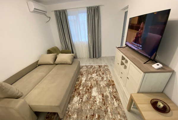 Dispune de un living luminos echipat cu o canapea extensibila, TV, AC