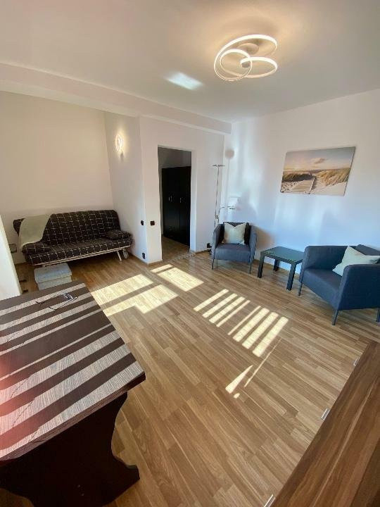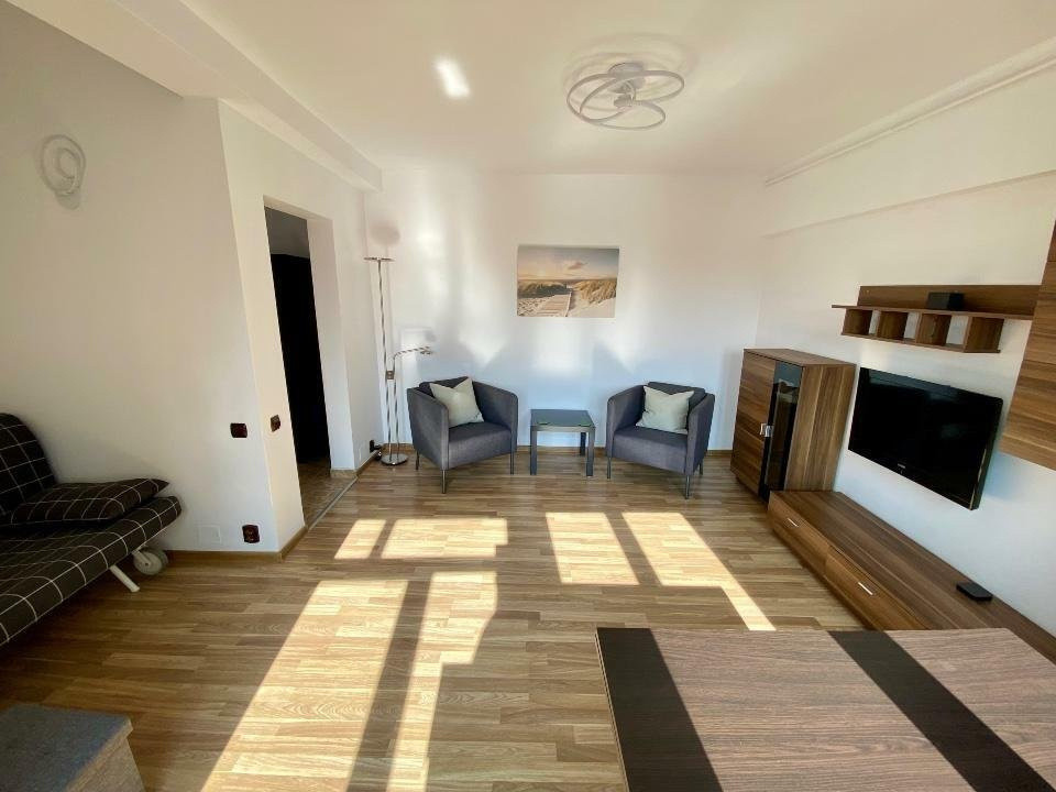 Dispune de un living luminos echipat cu o canapea extensibila, TV, AC, dressing incapator, 1 baie.