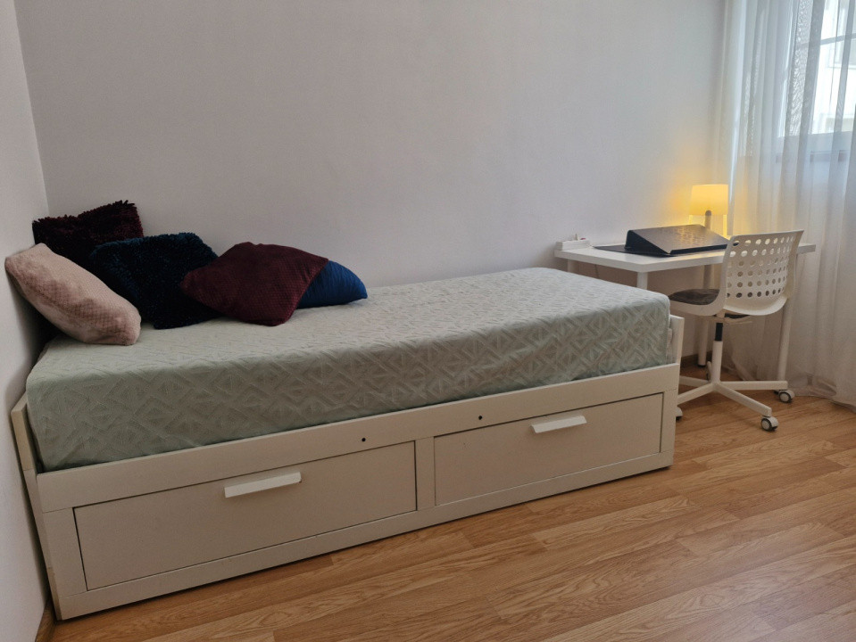 Dispune de un living luminos echipat cu o canapea extensibila, TV, AC
