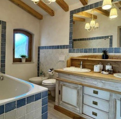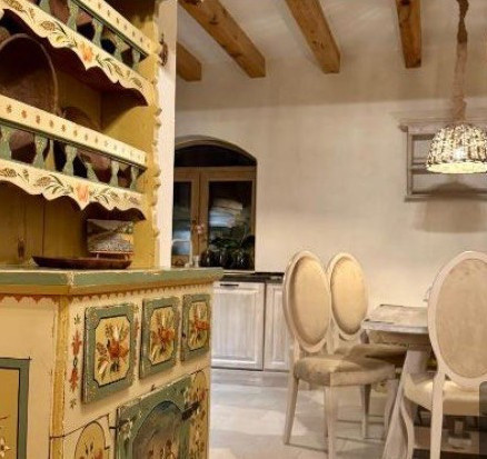 • Mobilier din lemn masiv periat și sculptat, cu elemente pictate manual